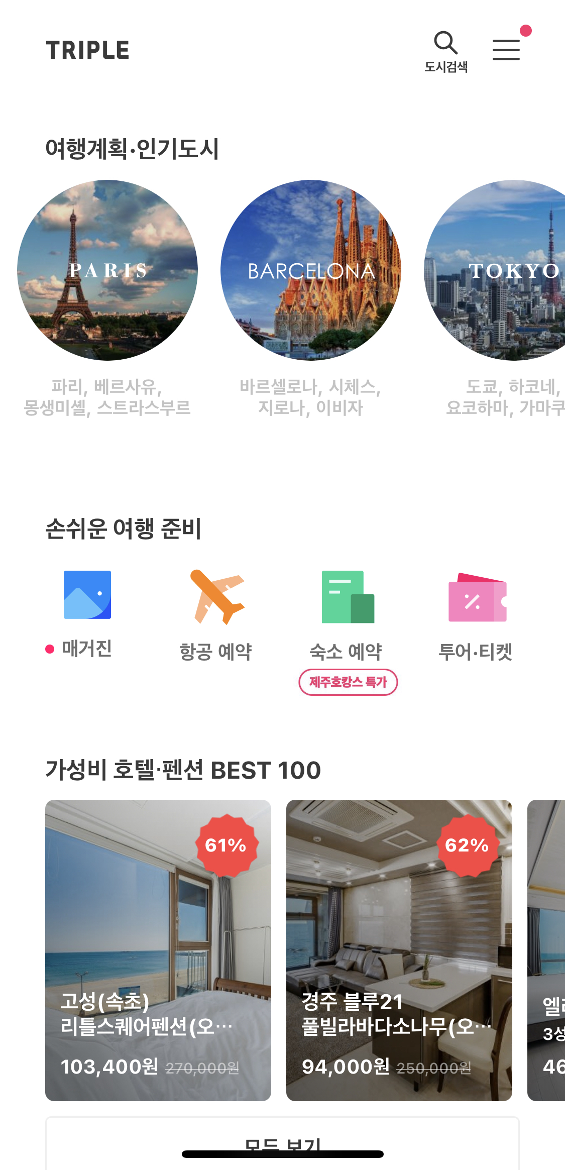 바로 여행하는 사람들의 필수 앱인 트리플 입니다. 지금은 시국이 시국인지라 국내여행이 가장 메인에 있지만 전세계 220여개 도시의 가이드가 담겨있어 계획을 세우는데 편리하게 참고할 수 있어요. 내가 가고 싶은 장소를 직접 선택해서 넣을 수도 있고, 해당 도시를 얼만큼 방문할 계획인지에 따라서 자동으로 코스를 추천해주기해요. 예를들면 파리 여행 3박 4일 코스 이런 것들이요.