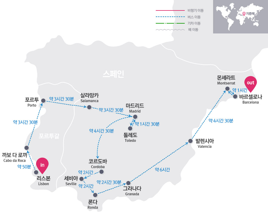 [이동 경로 : 포르투갈 리스본→포르투→스페인 살라망카→마드리드→톨레도→마드리드→코르도바→세비야→론다→그라나다→발렌시아→몬세라트→바르셀로나]
